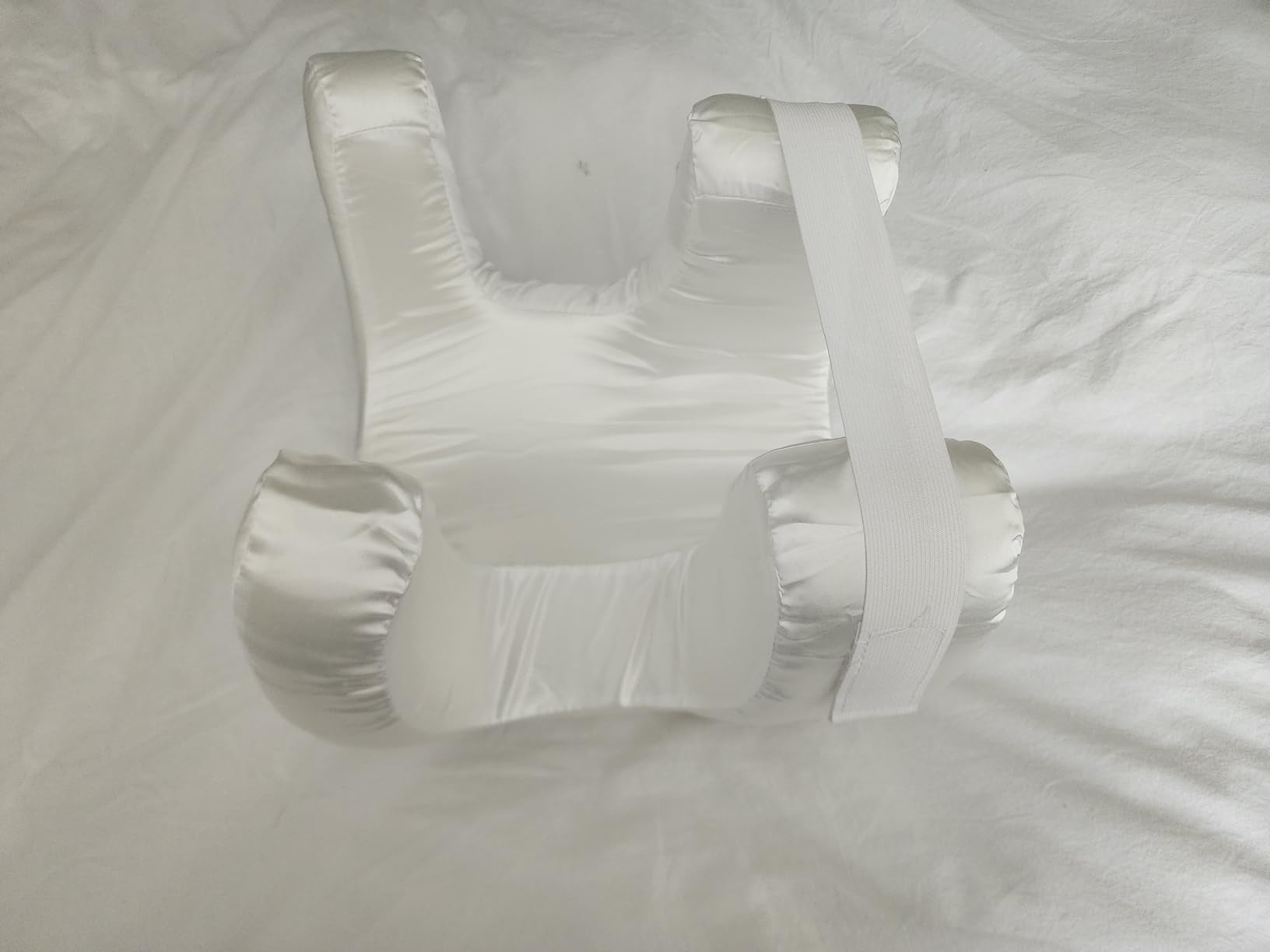 This pillow really does help me keep my head from moving around too much while I sleep and provides support. It does take time to get used to and I am still uncertain what that strap is for - I don't want THAT around my neck and it doesn't seem to be useful for the top of my head. But it does keep the sides of my face from touching the pillow when I sleep on my side.The material is silky and soft, the cover comes off so it can be washed. The foam material is comfortable and provides support. If anyone figures out what that strap is for and how to use it, please review and let us know! There were no instructions with this!